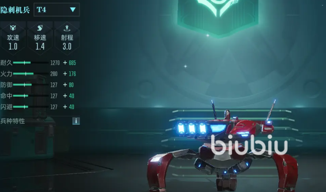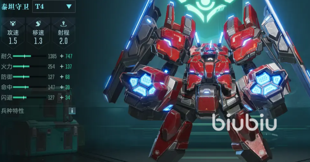 它拥有全兵种最高的耐久成长值,和比较高的防御属性,不过由于体型大的关系,导致移动速度慢不适合游击和拉扯,再加上它的射程和攻击范围小,必须贴脸才能攻击到,所以非常适合站在前排,吸收伤害给后方的队友们创造机会,它有普通和防御两个形态,普通形态用激光类武器攻击,实战作用不大,建议在转移阵地的时候切换稍微增加移动速度,防御则是在正面竖起盾牌,降低攻击距离和移动速度,但能减少来自正面的输出,不过需要注意在防御形态下,来自背后的攻击会让它承受更多伤害,所以实战一定要注意好地方隐刺机兵的动向,防止背后偷袭。