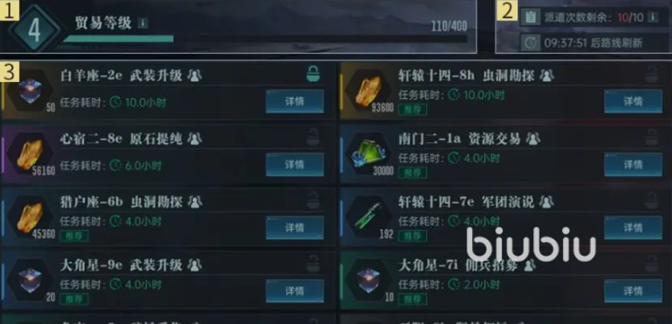 在基地建造了“贸易中心”后就可以解锁这个功能,从日常挑战找到星际贸易页面,左上角是当前贸易等级和经验,右上是派遣的次数和任务刷新还需要的时间,而整个界面的下方则是各种任务、奖励、以及耗时。