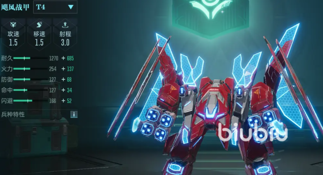 飓风战甲拥有最高的闪避,生存能力强,最大的特点是能根据敌人的类型来出击,它能转换地面和空中两种形态,地面形态会对地面目标造成更高伤害,同理空中形态会对空中敌人造成更高输出。