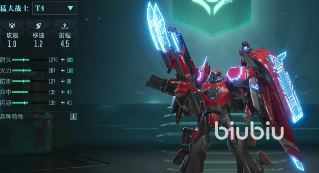 猛犬战士拥有不错的攻速和移速,灵活是它最大的特点,此外它的攻击距离也仅次于火山战车,在所有兵种中排第二,能从较远距离对敌人攻击,保证自己的输出环境,他虽然没有切换形态的能力,但在进入战斗后移动尾焰会变成蓝色,增加15%的移动速度。