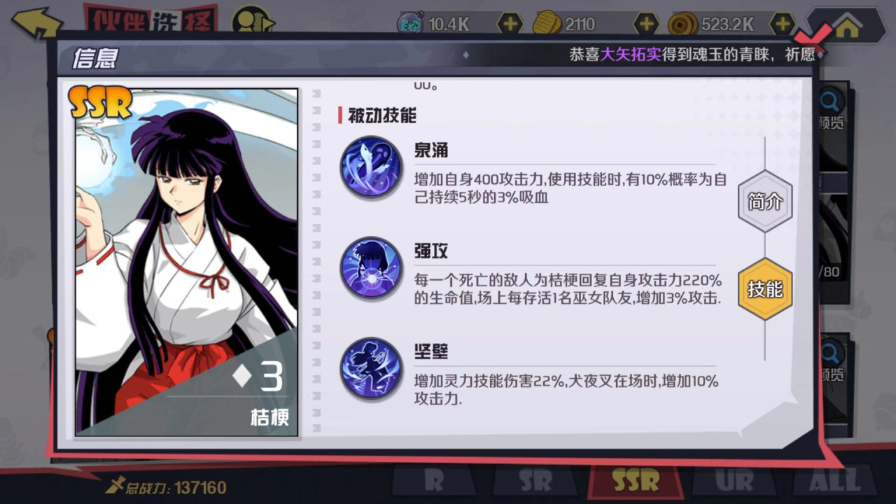 彼世巫女桔梗是游戏中SSR的人物,非常罕见,获得途径只能通过祈愿来获得,这个就需要小伙伴有一定的运气。当然SSR人物都是比较强力的,彼世巫女的好处在于他的被动技能带回血,以及各方面的辅助能力,因此她需要配合一个好的阵容有好的输出手配合才会发挥出她的实力。