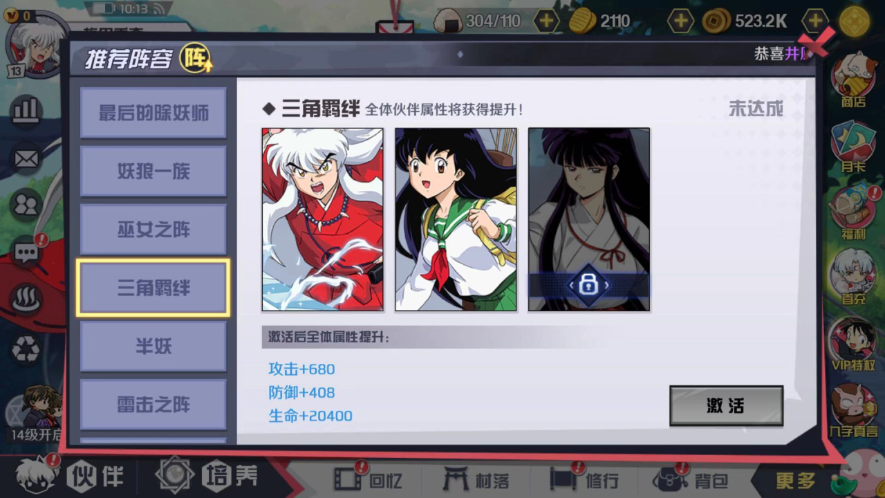 在三角羁绊这个阵容里有犬夜叉也可以配合出增加攻击力的效果,大家可以多多尝试几种阵容搭配说不定会有不一样的效果。