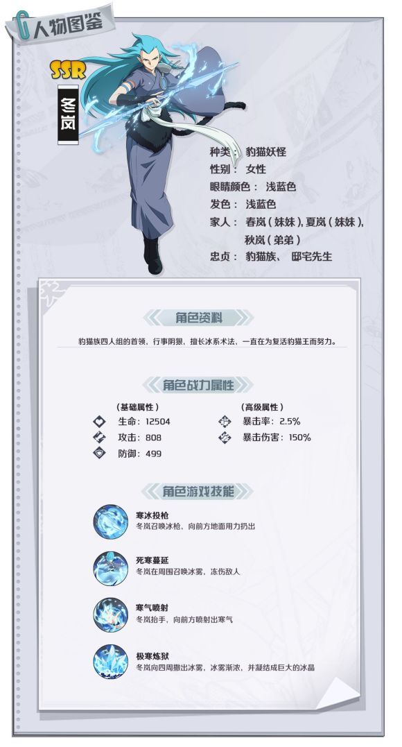 第四位冬岚,冬岚,豹猫四天王的大姐大,豹猫中唯一的SSR级角色。与夏岚类似,冬岚也属于甩技能的爆发型角色,但强大的普攻机制让冬岚能持续攻击敌人等待技能CD来下一套爆发。再加上独特风格的技能,冬岚拥有极强的针对性,成为“犬妖杀手”。