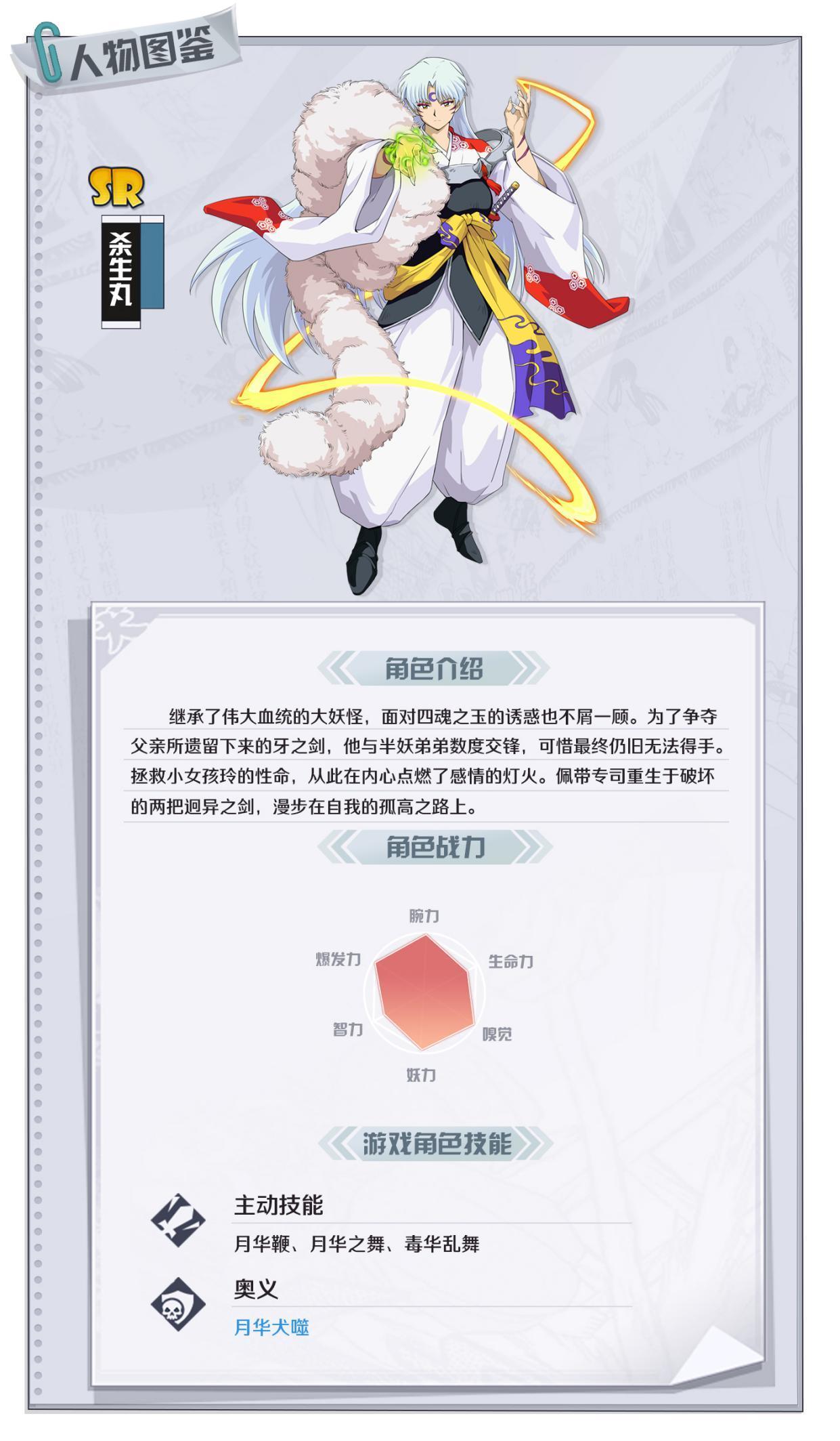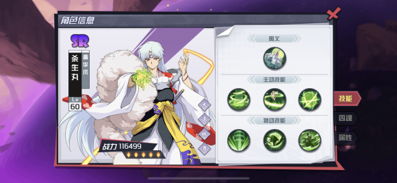 首先杀生丸SR,SSR,UR都有这边我们从最平民向的SR杀生丸讲起,SSRUR处理起来也类似,因为杀生丸角色定位始终是差不多的,SR带好的四魂体现的价值更大,绿爪杀生丸身板硬,开团先手能力优秀,爆发伤害高,具有很强的针对克制作用。绿爪在技能上高度还原了杀生丸初登场时那霸道又优雅的战斗方式(奥义除外)。绿爪的碎片获取十分稳定,非常推荐萌新培养。