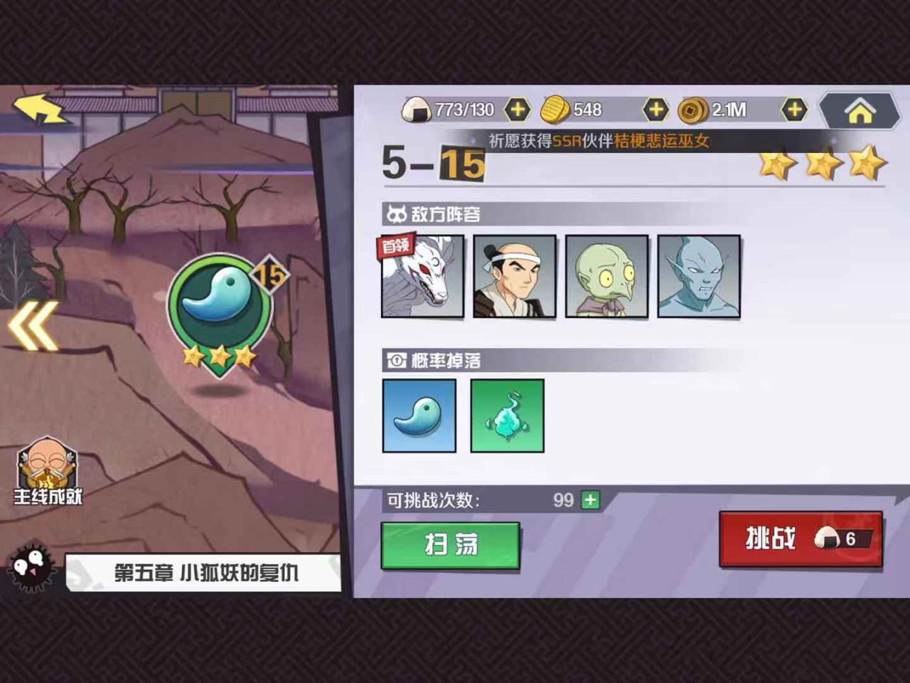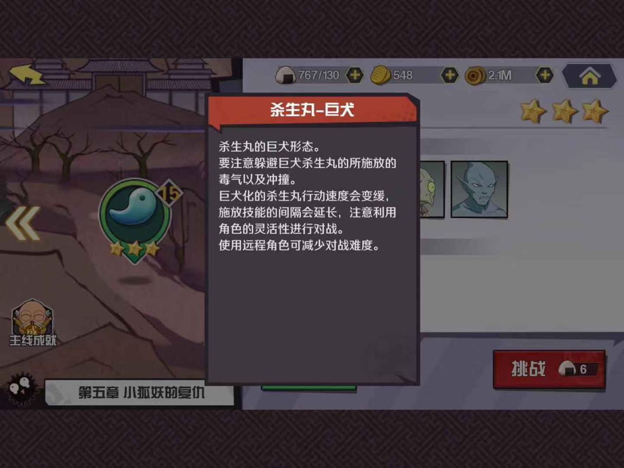 主线副本5-15作为前期比较大的一关,以前期的能力通关是有一定的困难的,特别是玩家手上没有那么多的SSR的时候,仅凭低等级R阶角色,通关会比较费力。5-15的敌人主要是极乐鸟,锁链小妖和弓箭手武士,这些都比较好处理,主要是BOSS杀生丸巨犬,很难对付,要破防才可以给到连击攻击,巨犬冲撞和释放毒气都会带来不小的伤害,近身容易被击飞放不出技能。