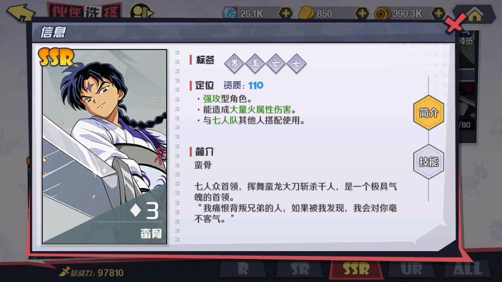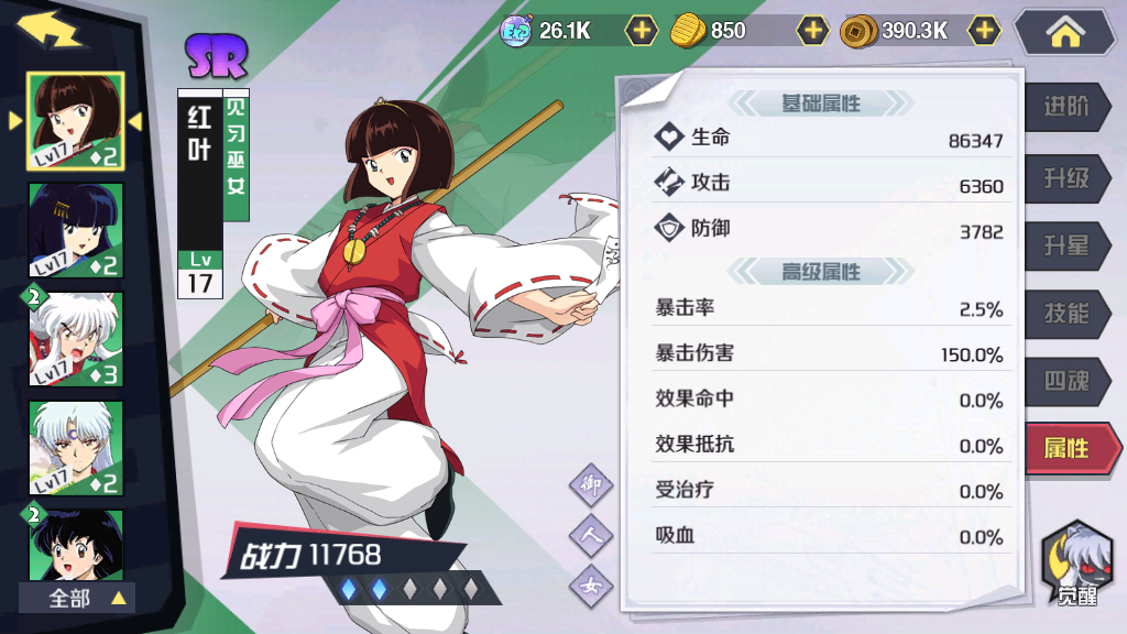 除了红叶,队伍当中还可以考虑搭配杀生丸和犬夜叉这样的角色,角色的级别越高越好。犬夜叉在战斗当中不仅可以对敌人进行反扑,利用其自身的技能优势还能够快速的解决掉敌人。杀生丸的优势则更加明显了,使用技能不仅可以对敌人造成伤害的同时,还能够为队友提供生命恢复。