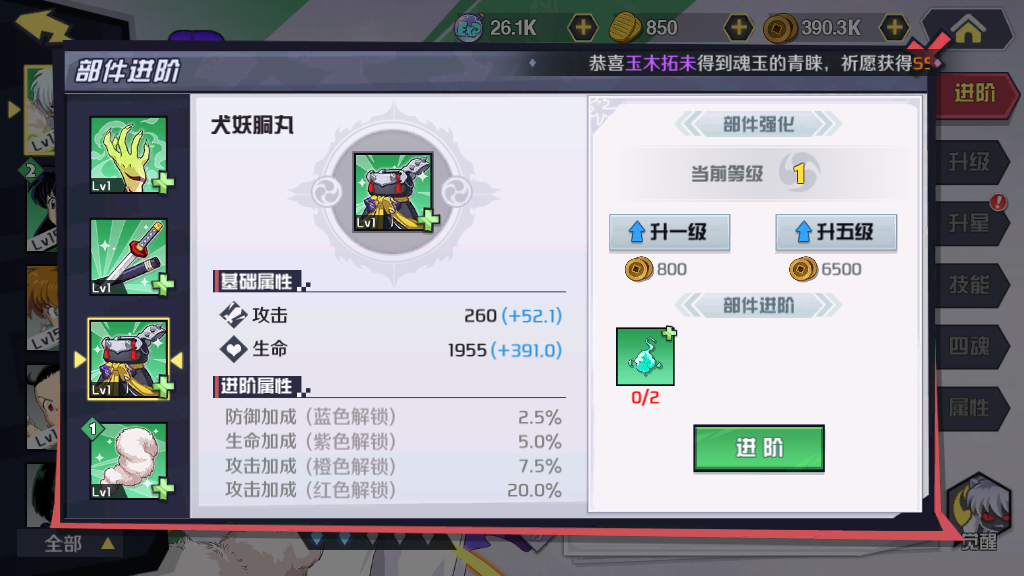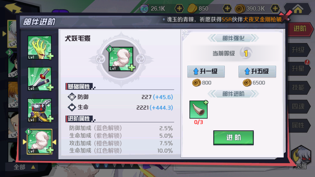 第三件装备“犬妖胴丸”,该装备主要提供额外的攻击力,大幅度提升也会让杀生丸变得更强势。值得注意的一点,玩家们将其解锁到蓝色和紫色阶段时,额外属性会增加防御能力,当达到了橙色和红色的时候,会大幅度的提升攻击力,最高增加20%的攻击,这是后期必须强化的装备。