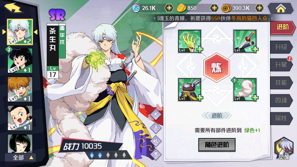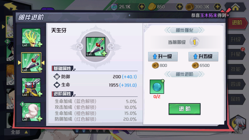 首先,主要的攻击装备“毒华爪”。该装备为杀生丸提供额外的攻击力和生命值,在每一次进阶之后,额外属性都会得到大幅度增加。在前期的游戏当中,玩家们可以考虑优先提升该装备的等级,这样才可以让杀生丸在前期更具有优势。