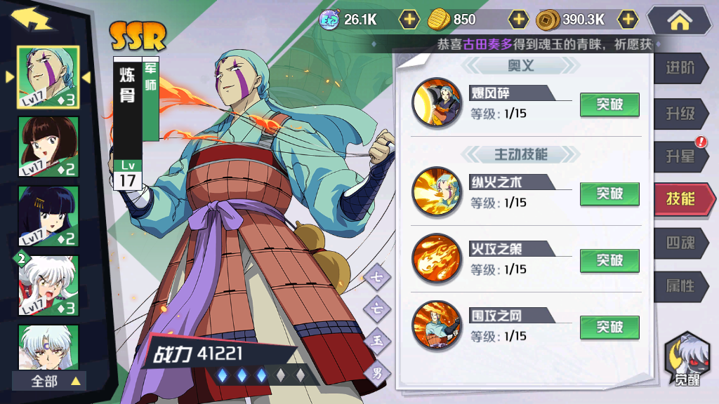炼骨作为一名SSR英雄,在队伍当中的输出能力同样不能小觑。凭借自己“纵火之术”技能,可以对小怪们造成群体伤害的同时,额外的附加上一层灼烧效果,该效果可以让敌人持续掉血,在该关卡的主力妖怪出现的时候,利用此技能可以快速将敌人消耗掉。