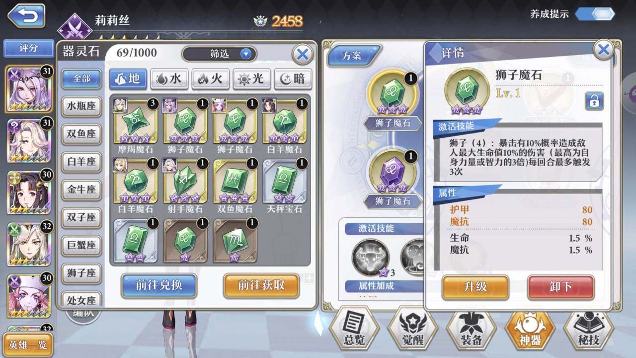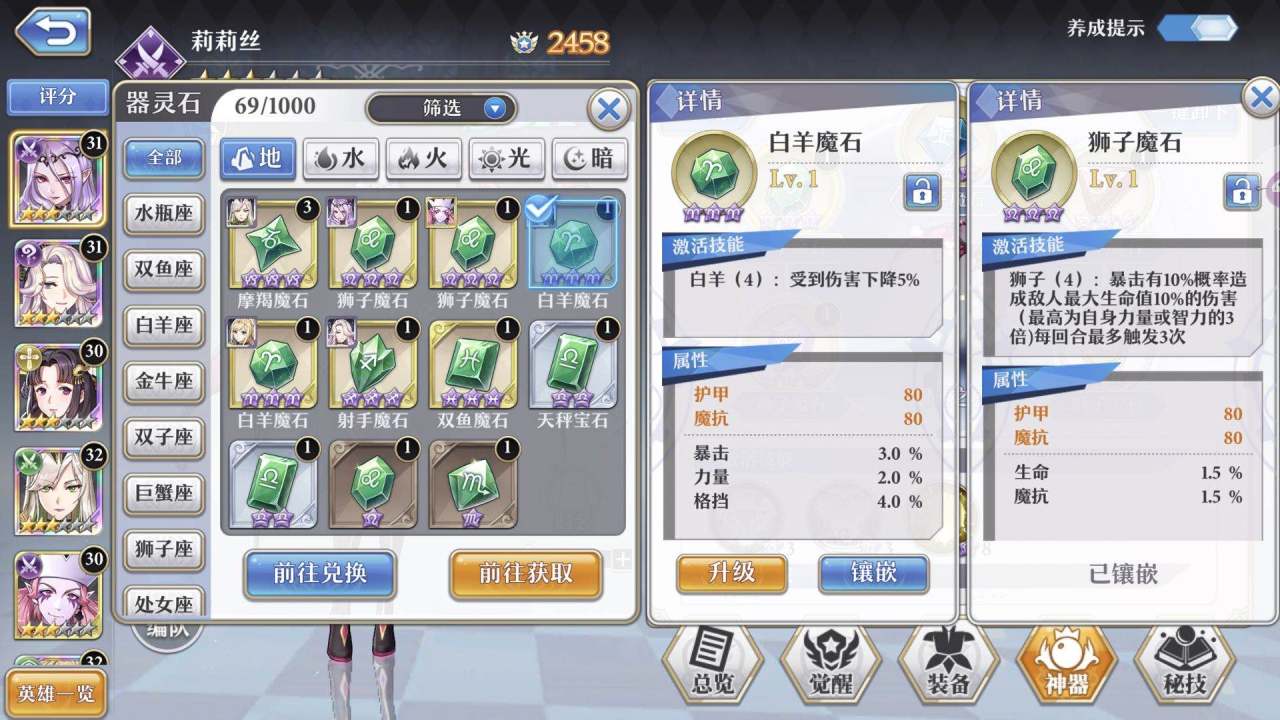 器灵石种类:总共有12星座,也就有12个种类的器灵石,每一种器灵石各有5个,增加的属性是相同的但是功能不同,比如双鱼和天秤都是增加同样数值的智力值,但是功能方面,双鱼可能是增加暴击率,而天秤是增加某些属性的抗性。(打个比方,属性是乱说的)
