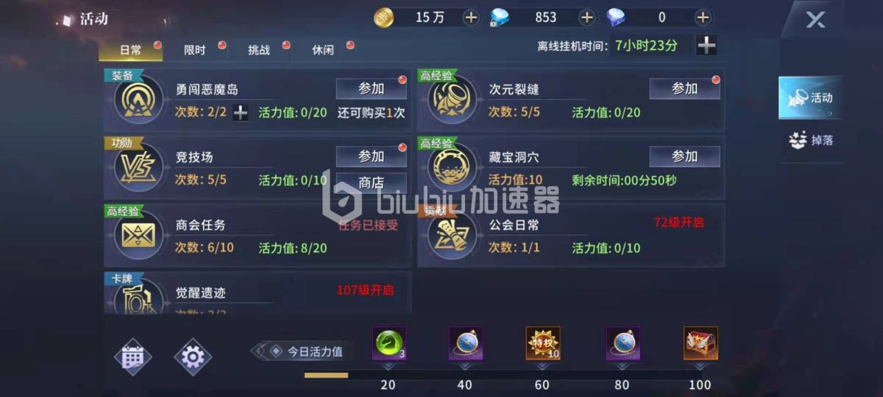 清理完主线之后,其他的活动中优先做次元裂缝,藏宝洞穴,商会任务这三个,这三个都是经验奖励非常丰厚的任务,还是一句话新手期经验比什么都重要。至于装备更新的非常快,过早的投入精力也没什么用。之后就是竞技场,竞技场在获得排名之后可以有一次性的奖励,而且竞技场在初期都是机器人占据着排名,挑战机器人是很简单的,所以再有了一定的战力基础之后,就去打竞技场,先把一次性的排名奖励拿到手才说。