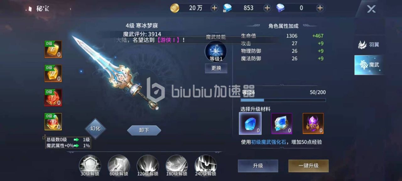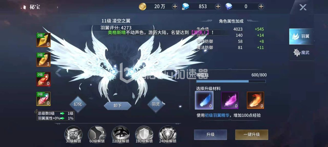 第三、秘宝升级,秘宝也就是翅膀和魔武,在起源战纪中翅膀和魔武的地位也是很重要的,不仅仅是为了炫酷,翅膀和魔武可以提供大量属性。翅膀可以进行升级,幻化等操作,升级需要使用羽翼精华,能提高翅膀的基础属性。幻化是需要获得羽翼的皮肤,有了皮肤的羽翼不仅外观更拉风了,额外的属性也很好高。魔武的培养也是升级和幻化,只不过需要的材料和翅膀不同而已,这两个需要同步进行。