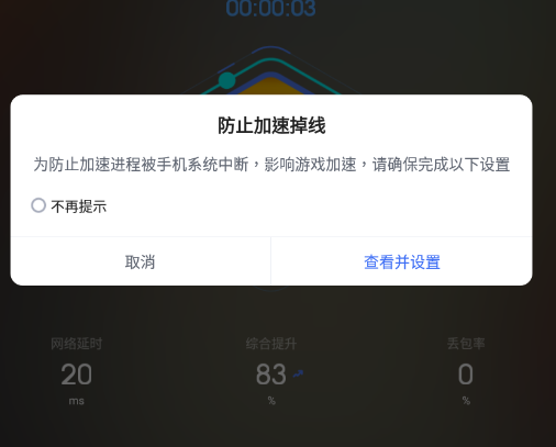有时手机系统会中断Biubiu加速进程,为了防止这种情况,Biubiu加速器在玩家首次加速时会进行提示,点击“查看并设置”后,根据教程内容逐步完成相关设置即可。