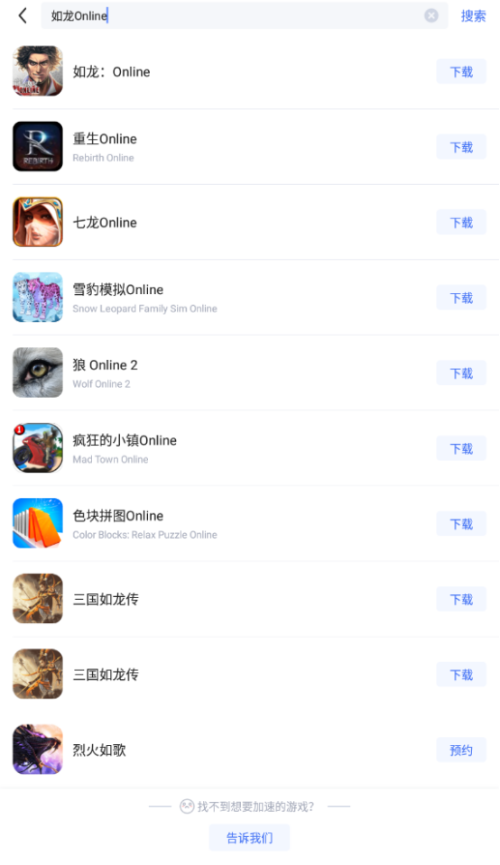 点击Biubiu加速器右上角的“搜索”按钮,在搜索框中输入“如龙online”,找到游戏之后点击右侧的下载按钮,就可以开始下载了。