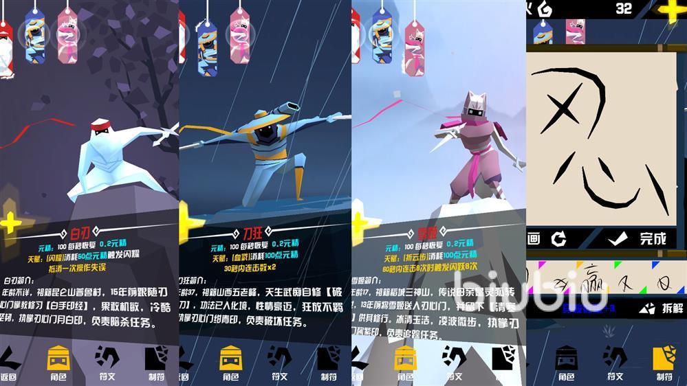 首先要跟小伙伴们说的是在这款游戏中武器和技能是分开的,武器可以帮助玩家人物获得高伤害和血量加成,而角色人物则是有着各不相同的技能;那么我们先来讲一下技能是什么,例如:白刃的技能是抵挡一次失误、而刀狂则是30秒内连击数×2、雾姬则是能在60秒内连击八次可以闪跃八次、而每个忍者都有自己的独特技能。小伙伴们也可也给角色进行升级,而角色升级是通用享受等级提升的,再也不用担心需要把每个人物都升级一次了。