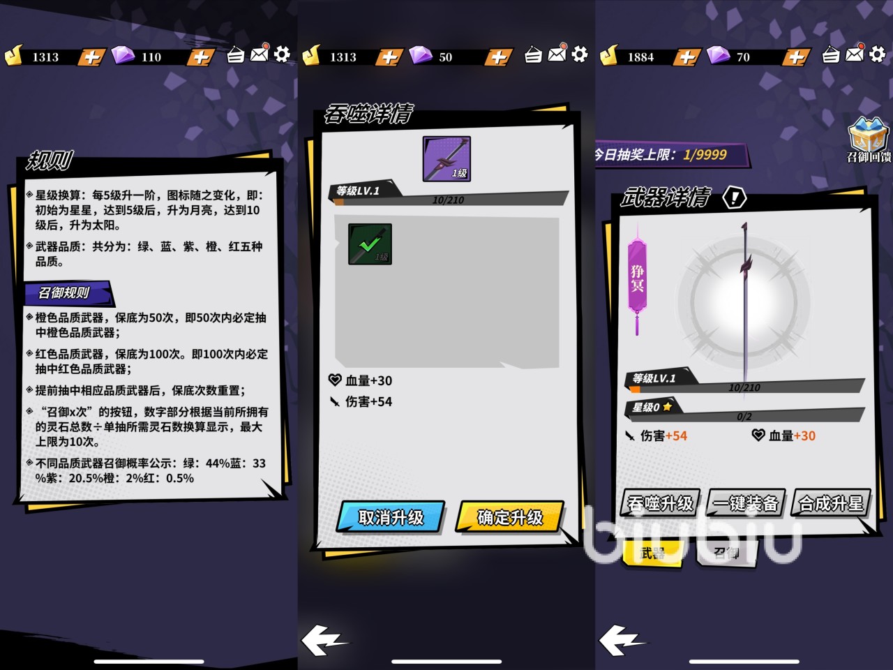 接下来我们讲一下武器的品质和属性加点,武器品质:共分为:绿、蓝、紫、橙、红五种品质。还有武器的星级越高伤害就越高,星级换算规则则是每5级升一阶,图标随之变化,即初始为星星,达到5级后,升为月亮,达到10级后,升为太阳。而武器的升级方式是吞噬升级,所谓吞噬升级就是通过吸收掉低品质的武器来增加高品质武器的属性加点。下面小编要给大家讲一下这款游戏怎样获得高品质武器和强力技能忍者的途径。