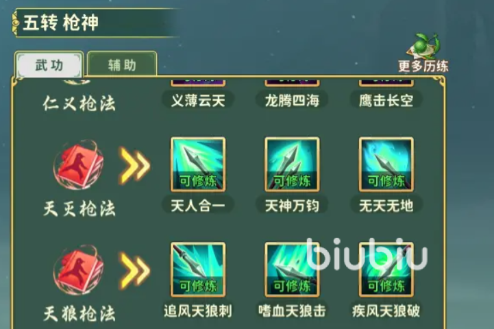 3转去点满增加攻击力的“乾坤挪移”,乾坤挪移是输出的关键核心,但如果打PVP的会更加建议能提升生命值的横练太保,4转点增加伤害的怒意之吼以及末日狂舞,5转点增加武功防御的灵甲护身。