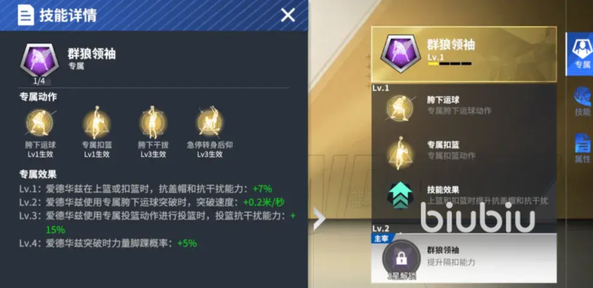 他的专属技“群狼领袖”,在一级的时候就会解锁专属扣篮动作一级胯下运球,并且还会上篮或者扣篮的时候,增加7%的抗干扰和抗扣帽能力,这样的专属外加额外加成,能保证在姿势帅气的同时快速得分。