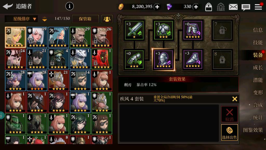第二套装备推荐选择疾风套装,勒拖属于一个技能型的辅助角色,战斗中想要为队友带来辅助的能力,就需要频繁的使用技能才可以达到这些效果。而疾风套装的主动属性可以重置全局的冷却时间,最少50%,最多70%。也就是说全部的角色都可以吃到这个效果,发动之后只需要等待一小会就可以继续使用技能来战斗,对于勒拖的提升是非常大的。