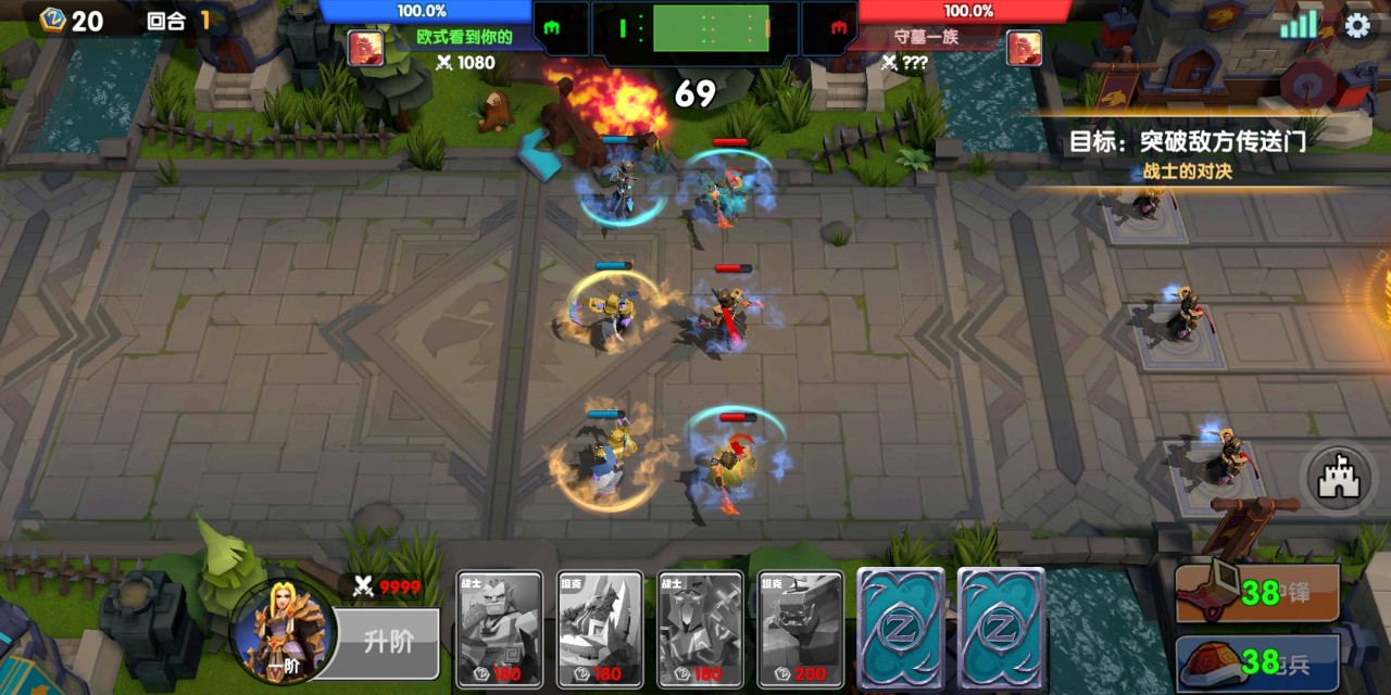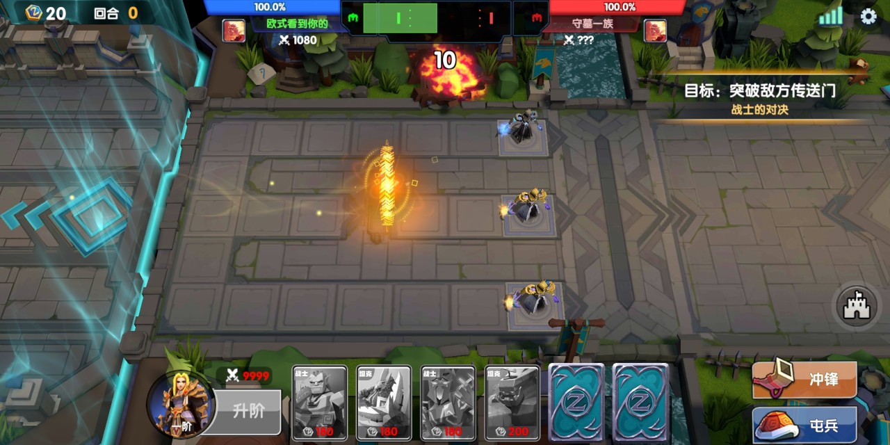 由于战币不足,因此玩家只能在两路布置极寒巫妖,剩下一路布置巫妖,作战目标是突破敌方传送门。该关卡除冲锋和屯兵外,无法使用法术,而且也不可刷新卡牌。