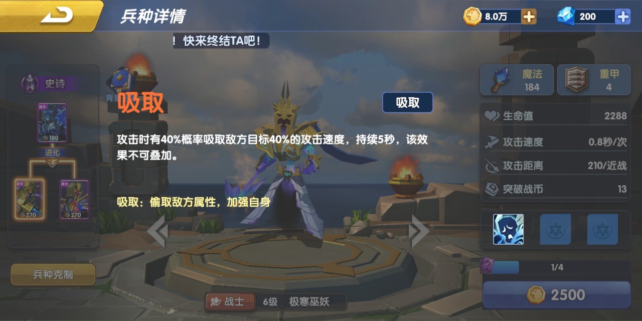 首先需要注意,法术伤害克制重甲,物理伤害克制轻甲,而在备选卡牌中只有雄鸡战士、巫妖是法术伤害。此外雄鸡战士攻击速度过于缓慢,因此建议选择极寒巫妖,被动技能吸取能在攻击时有40%概率吸取敌方40%攻击速度。