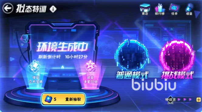 普通模式分为三个难度,每次挑战消耗1个特训点,每通关一个难度,就可以获得相应数量的β核心和β数据。挑战模式分为困难,修罗,炼狱3个不同的难度,每通过其中的难度就能获取对应的限定丹青小姐姐超Q头像一枚。