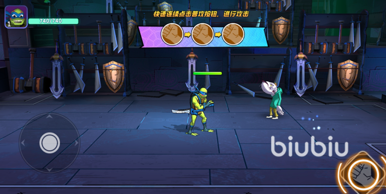 而游戏最主要的战斗系统做的细节蛮好,每个神龟有自带的4个技能,按顺序上下左右点击可以触发连招,长按攻击键可以连续挥刀攻击,战斗时累积能量条可以出角色专属的必杀大招。玩家放大招的时候会有几秒钟的无敌时间,还有特写动画,看起来是非常帅。