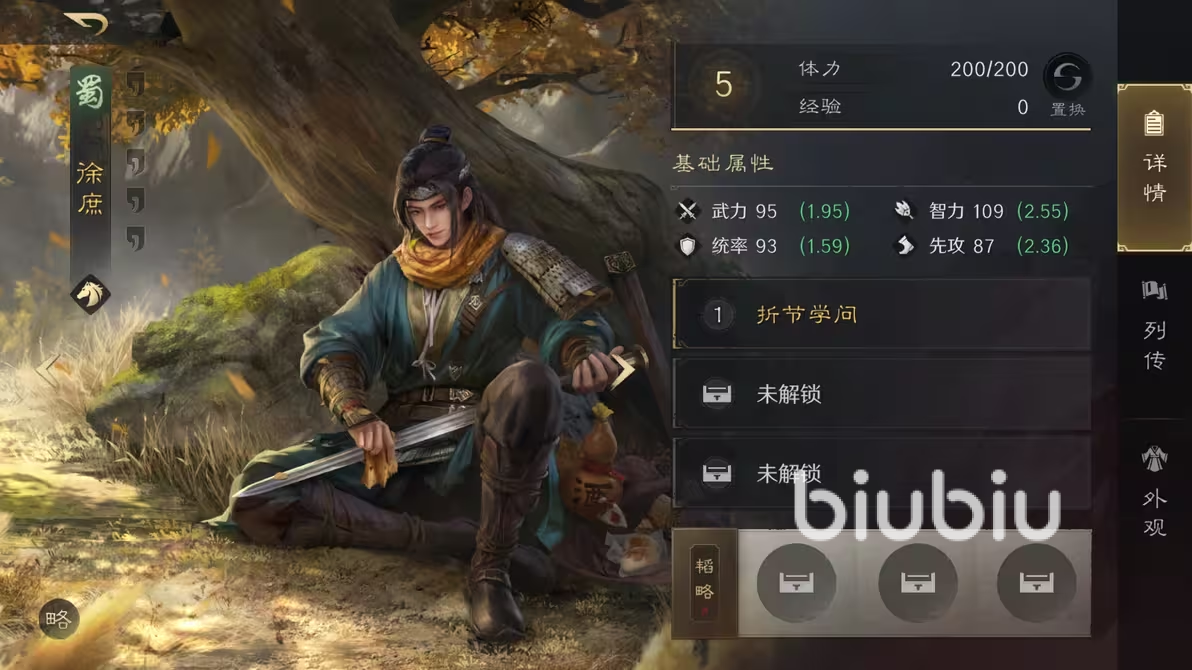 如果已经有该效果,额外提升1-2%主动战法发动率。整军在己方三人均为盾兵时生效,自带战法变更为专属战法,对各属性最高的敌军添加畏惧并造成一定伤害。