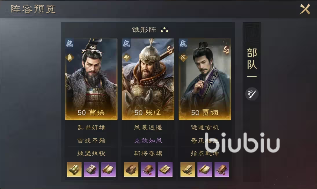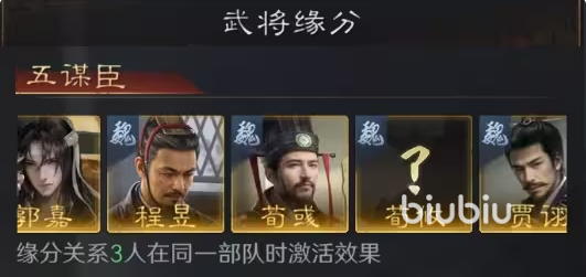 武将缘分未“五谋臣”,分别是郭嘉,程昱,荀彧,荀攸,只要有3个人同时在一个部队,就能激活缘分效果,可让具有缘分效果武将“看破”提升5%,受到伤害则降低4%,在配队时巧妙运用这种效果,能进一步提升队伍生存。
