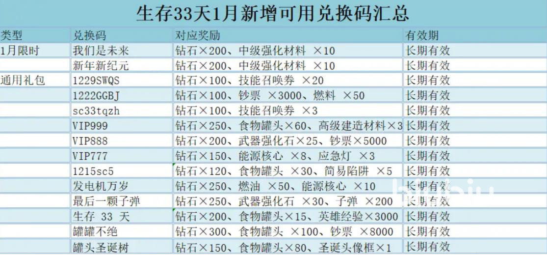 目前可供使用的兑换码有:0105LMDJ,这个有效期截止1月11日,注意不要过期。然后是黑龙王、新年新纪元、罐头圣诞树。还有包括通用码:vip666、vip777、vip888、svip666、svip888、fl666、fl888、1208sc4、生存33天、罐罐不绝。