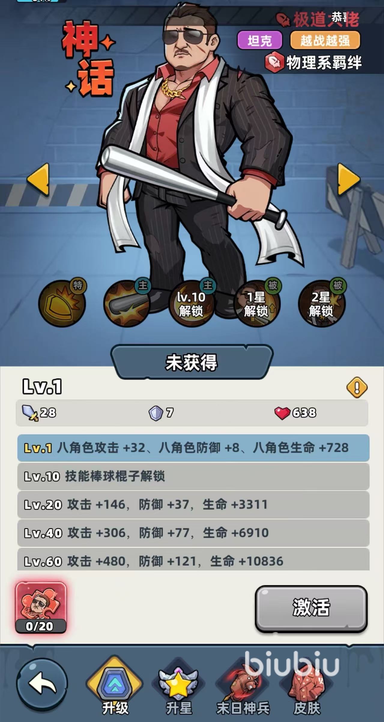 至于其他神话角色就要去电台中进行招募了。这里更推荐大家获取极道大佬,毕竟大家现在还缺少一个坦克。有了它就可以越战越勇,因为它可以获得高额攻击力、防御力以及生命值加成。技能方面的话,可以获得高额免伤,并有概率格挡敌人攻击。技能也可以接近敌人并施加一闷棍,大招的话,就可以用出它的棒球棍,并造成范围伤害,击退敌人的同时,还可获得物理攻击加成!