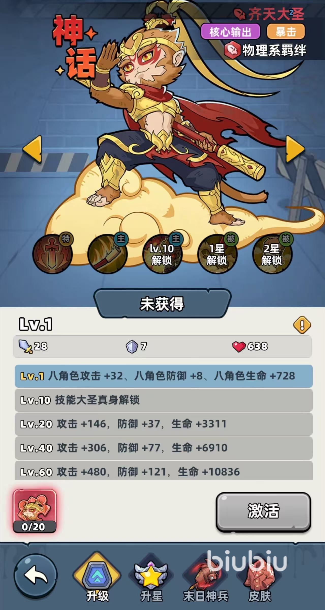 另外还有一个七天签到神话英雄——齐天大圣,作为一个物理爆发输出型角色,同样值得大家拥有!更重要的是,连续上线七天就能获取。它的特性是可以提升暴击率以及所有伤害,技能可以让它频繁用出棍击,伤害越大越高。大招的话,就可以直接变身成斗战胜佛,并大幅度提升伤害,让自己的暴击率变高。其他技能的话,也差不多都是是使用金箍棒,并带有范围物理伤害,还有一定的概率击飞敌人。若是二星的话,还可以召唤猴子猴孙,辅助大家战斗!