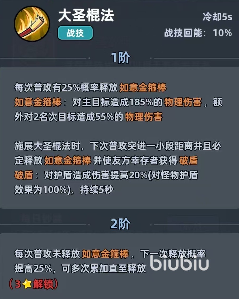 大家如果想要以齐天大圣为核心去搭配阵容,一定要优先养到3级,这样解锁的额外暴击加成,使得实力成为质变。达到五星时可以买暴击上限,想要跨服是必备的角色。至于队友选择方面,可以搭配上机甲战士、丸子头、熊猫大师、厨神或医疗老兵等,凑齐羁绊提供增伤就可以。实战过程中就是优先去攒能量开大招,变身期间一定要打满爆发,利用多重施法快速破盾和清场。