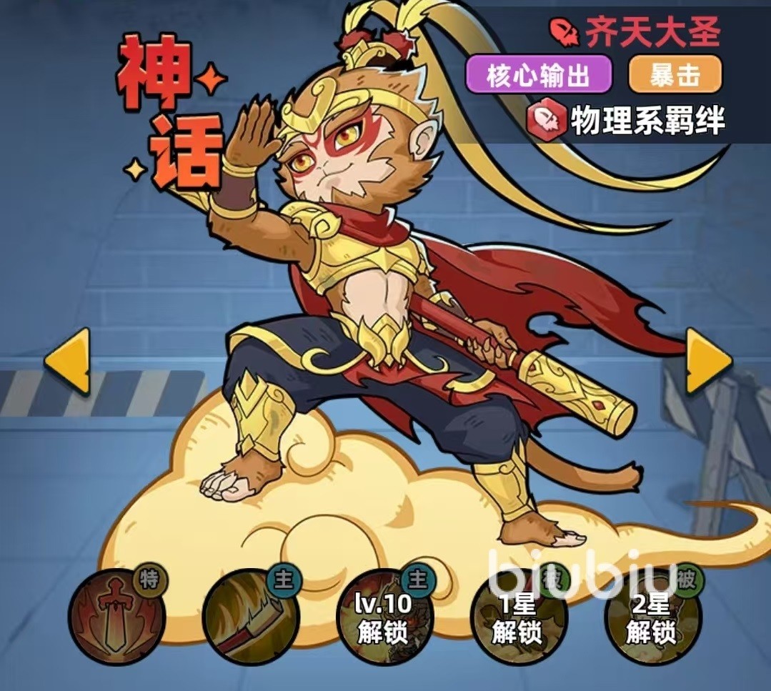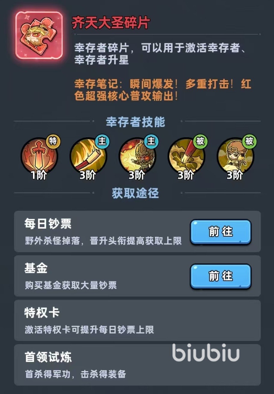 齐天大圣是属于游戏中的神话品质角色,他拥有物理系羁绊,自身的定位是核心输出,有着暴击方面的优势。齐天大圣的碎片可以通过每日钞票、基金、特权卡等方式来获得,获取途径较多,所以养成起来相对简单。主动技能大圣棍法,每次普攻时都有几率释放如意金箍棒,对主目标造成高额物理伤害。还可以额外对两个其他目标造成溅射伤害。在施展大圣棍法时,下一次普攻会突进一小段距离,且必定释放如意金箍棒,并使其他的幸存者获得破盾。
