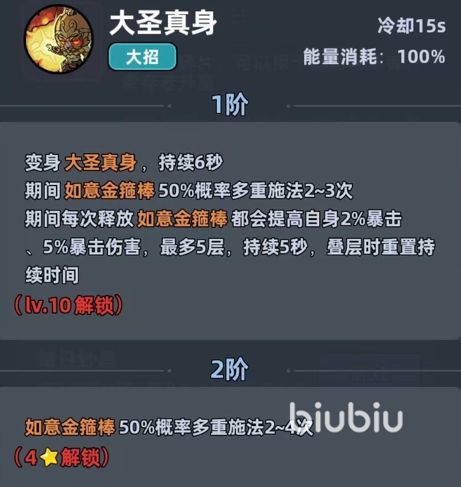 大招是大圣真身,变身之后持续6秒钟,在此期间,如意金箍棒触发之后有几率多重施法。每次释放如意金箍棒都会提高自身暴击和暴击伤害,并且能叠加起来。正是依靠这样的技能效果,使得齐天大圣成为现在pve和pvp通吃的强势角色。依靠暴击和大招的多重施法打爆发,是现在平民玩家必练的角色,后期依然强势。培养过程中达到三星后,暴击有飞跃性的提升,很克制护盾和一些高血量的精英怪。在养成方面,暴击率最优,其次是暴击伤害、攻击和最终增伤,攻速放到最后,所有选择都是围绕着暴击和爆发去堆属性。