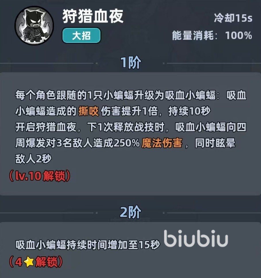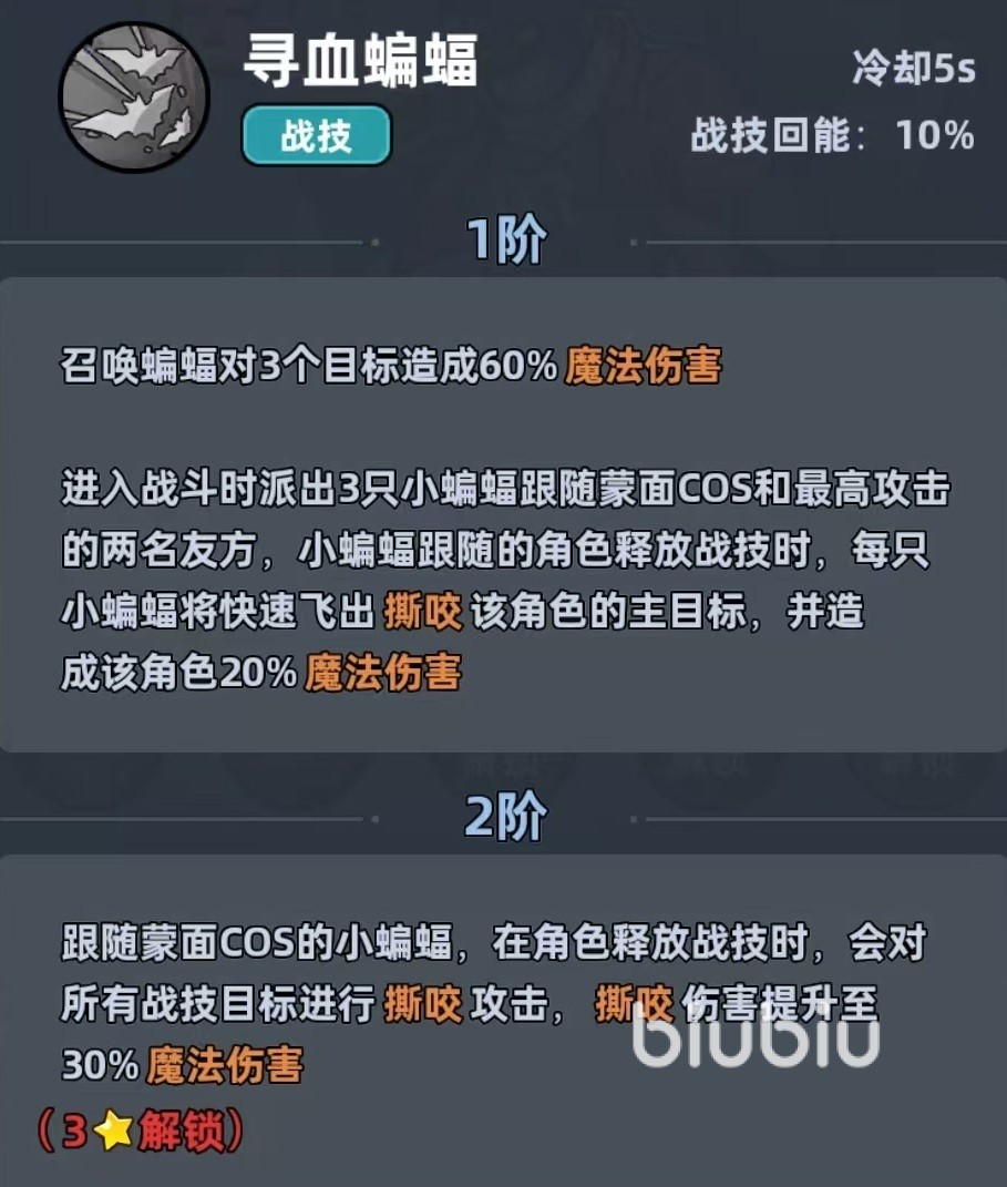 大招效果是每个角色跟随的小蝙蝠升级为吸血蝙蝠,造成伤撕咬伤害提升,在下一次释放战技时,吸血蝙蝠会向四周爆发,对敌人造成魔法伤害同时眩晕。这个角色的定位是魔法队的辅助输出,它的主要作用是给主c加伤害,同时还有回能和回血以及大招带来的群体控场效果,适合搭配忍术大师等魔法输出进行组队。在堆属性的时候,优先去提升魔法伤害,其次才是攻击和技能极速等属性,主要围绕着技能联动和增益拉满效果。
