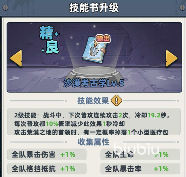 其中“沙漠考古学” 可以周期性生成血包,显著提升整个队伍的生存能力,是应对该BOSS的必备,另外也可以携带“潜水学”,这个能帮助及时解决溺水的角色,最后再携带 “急救专精”或“生命恢复强化” 等技能书,来确保在高压阶段能维持血量。