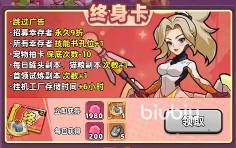 然后是非常关键的一点,开了终身卡之后所有幸存者的技能书孔位加1,这一点很重要,算是对整体战力强度影响较大的了。再就是宠物抽卡的保底次数要求减少10次,这个也是能节省不少资源。每日的罐头、猫粮这种资源本的次数上限加1。