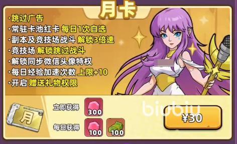 首先来看看终身卡所包含的内容,首当其冲的便是跳广告,很多这类手游的盈利点就是广告,买了终身卡并不意味着可以不看广告,但能直接点跳过了。然后是招募角色永远9折,也是帮大家节省不少资源了。