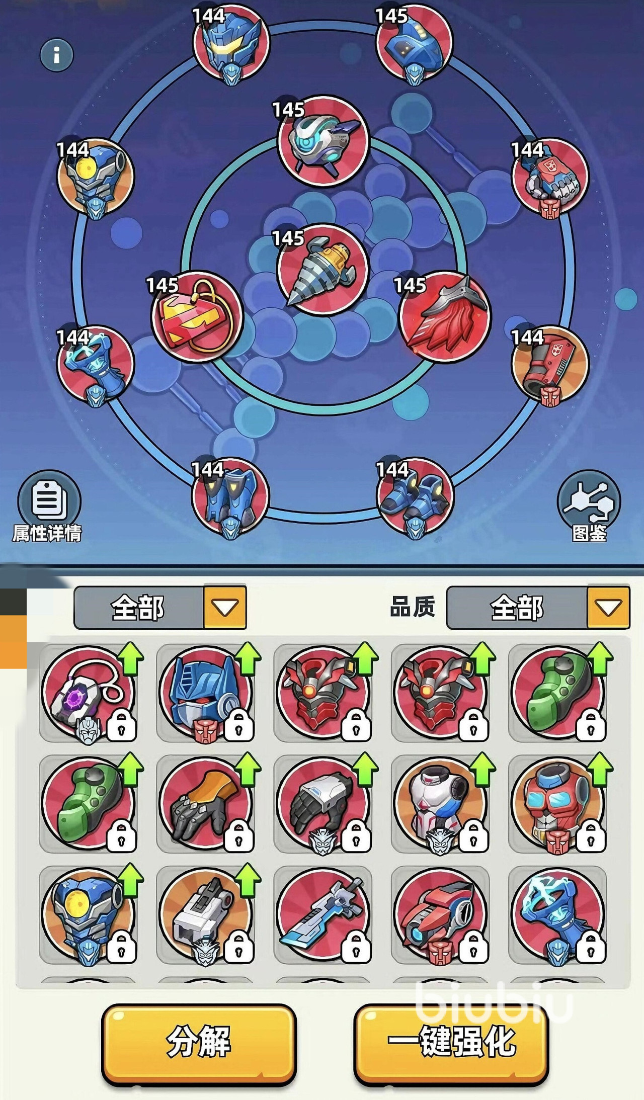 除了对装备进行更换之外,这里还可以进行强化,通过消耗道具就可提升各项属性。当提升到满级时,有机会解锁隐藏属性槽或者是一些额外被动效果。一些高品质装备会附带更多词条,建议优先选择。最后是超级武器工坊,这是翻盘神器,可以合成解锁战略级的装备,例如电磁脉冲手雷,濒死护背背心等。这些装备在很多战斗中甚至能直接逆转战局。