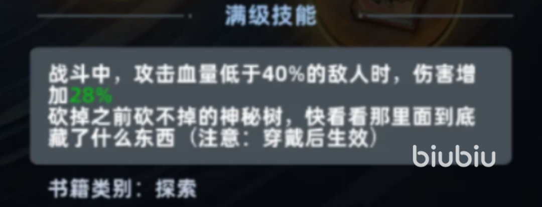 穿戴之后可以砍倒以前不能破坏的神秘树,获得新的探索区域。战斗中当敌人的血量少于40%的时候,合金镐还可以增加28%的伤害输出,使它在战斗中也能起到一定的作用。它具有很强的耐久性,从最初的1561进化到几乎无限的耐久,不需要经常更换工具,省心省力,大大提高了生存效率。无论是挖掘资源还是战斗支援,合金镐都表现出了游刃有余的感觉,是末日生存的利器。