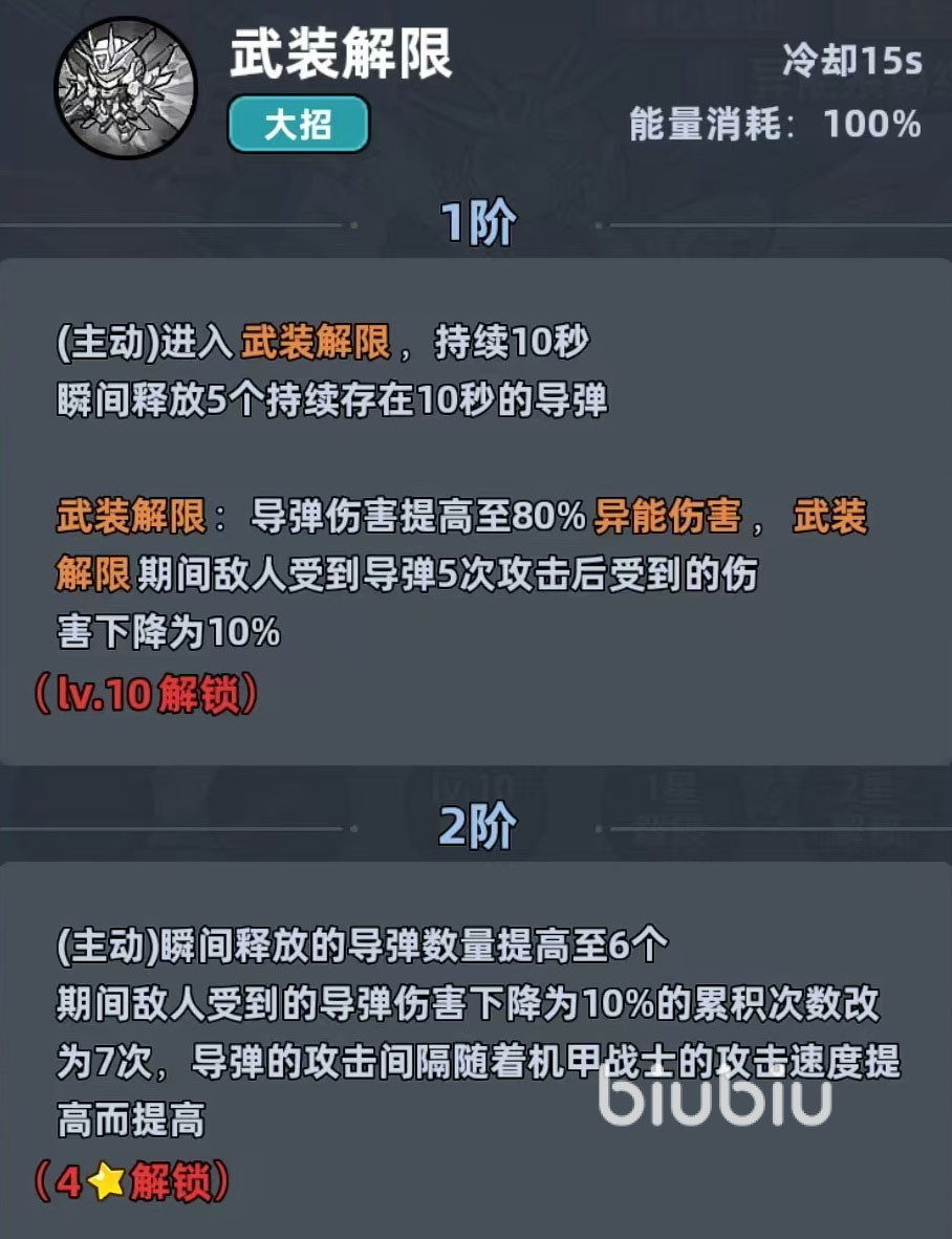 除此之外,该角色如果成功释放出最后的终极技能的话,就会直接进入到武装解限的,此时机甲战士就会直接释放出五颗导弹,另外还未发射的导弹伤害效果会得到很大提升。机甲战士这样的表现对于一些新手或者是开荒的玩家来说是非常友好,好用的,算是开局游戏性价比超高的一个角色了!