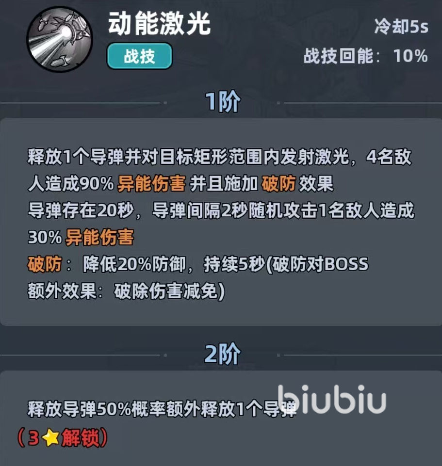 在该游戏中,机甲战士是属于异能方队的,主要兼顾的是主要位置以及副位的两方面的最主要的攻击力,发射导弹会对敌人造成范围性的上海,再加上破防技能的作用,可以大大降低敌人的防御效果,此导弹可以持续将近二十秒的时间,每间隔2秒钟就会直接对单个敌人开启攻击。