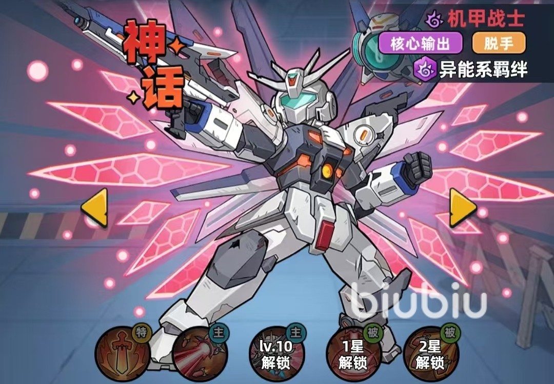 机甲战士是第一个获得神话品质的异能系角色,是挑战高难度BOSS的绝佳搭档,因为其拥有提升10%的追击速度能力,“动能激光”战技则可以造成对手破防效果,尤其对boss来说,还能额外造成破除伤害减免的效果。