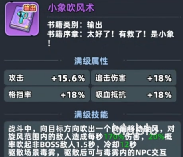 第二个就是书籍,咱们在收集的书籍里面有一个紫色的输出书籍,名字叫做小象吹风术,这个书籍可以在战斗的时候对目标的方向释放一道向前移动的旋风,除了可以对敌人造成伤害,还可以吹散场景的毒雾。