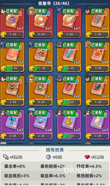 目前技能书总共被划分成输出、生存和辅助3大类型,并且有着蓝、紫、橙、红、金红从低到高5种稀有度,品质越高给予的基础属性加成幅度与特殊效果触发概率就会越高,此外大家在装配时要根据英雄的定位。