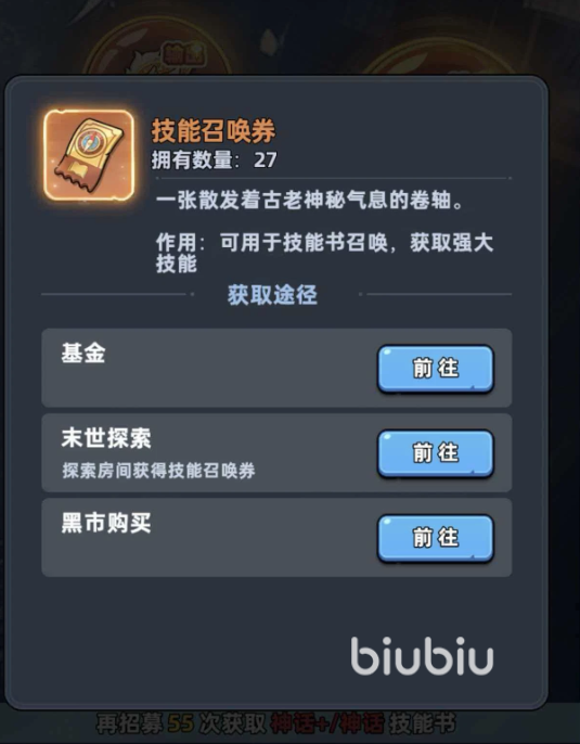 不仅能通过世界探索概率拾取,还可以黑市兑换利用手中的钻石资源来购买换取,不过由于钻石资源属于比较紧缺的,建议作为备选方案,此外还可以开通技能书基金,开通后每达成一次进阶,即可领取固定数量的召唤卷奖励。