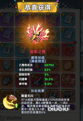 宙斯之鹰有着8角色攻击、全队攻防血等加成,它的“瞬雷天闪”能对10名敌人造成312%技能伤害,每0.8秒会落雷一次,一共6次,每一次的落雷都会随机让受到伤害的目标被麻痹0.5秒,使得该中招者在3秒内受到的伤害增加6%。