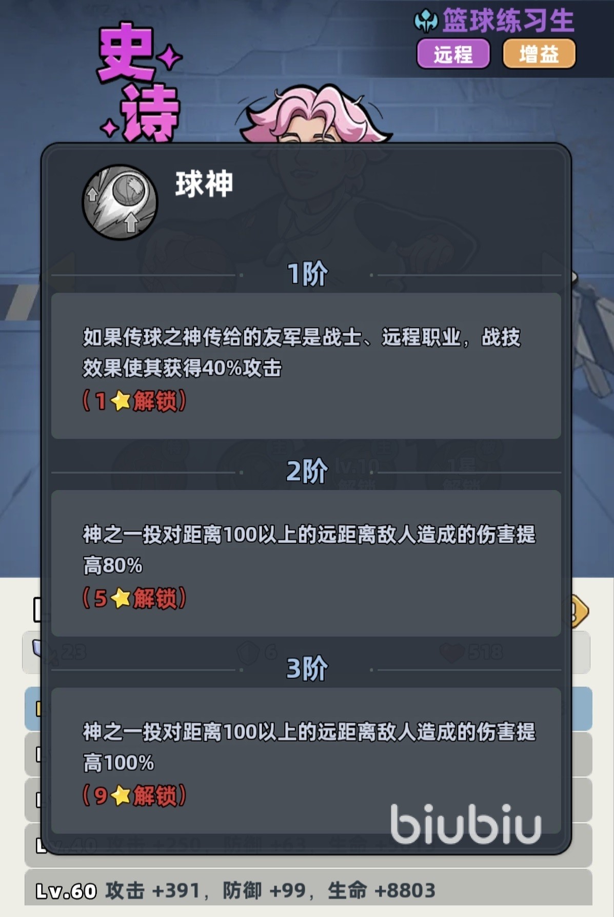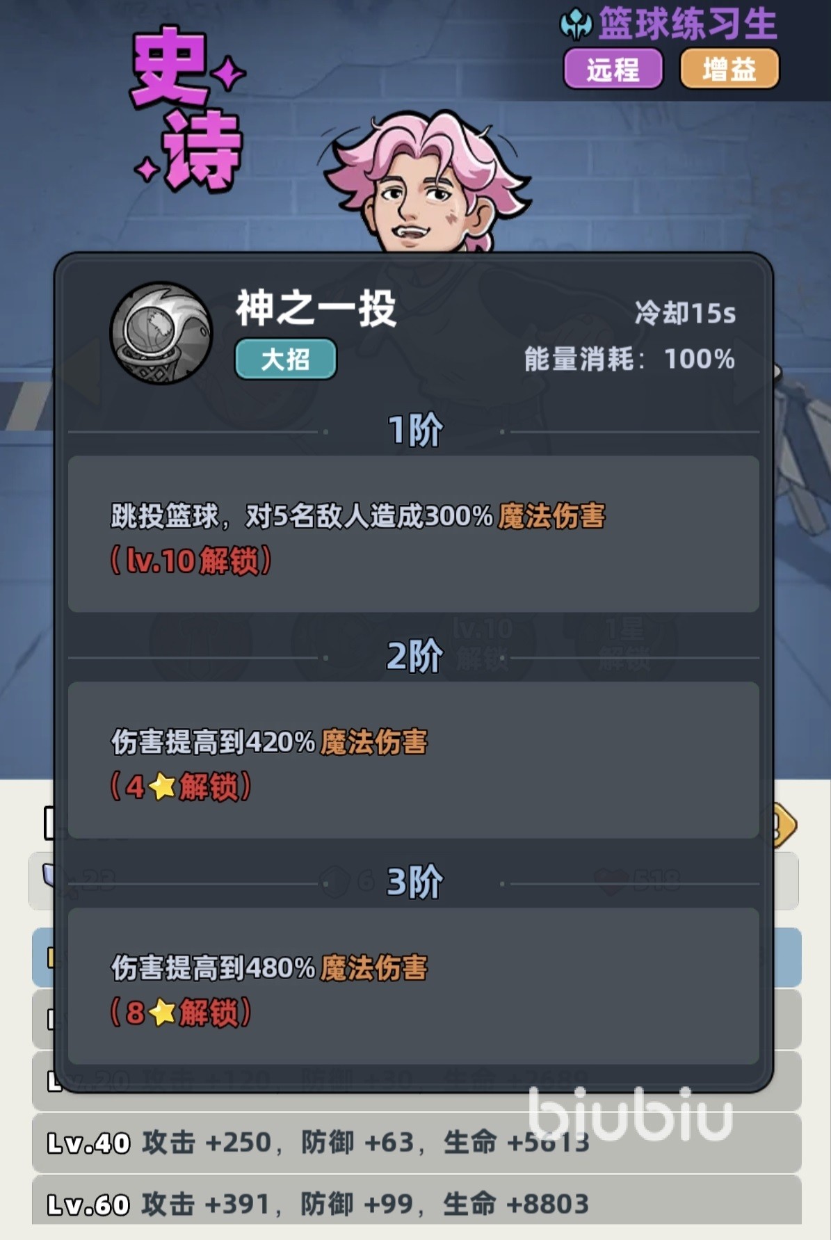 在技能方面,战技随机传球给三名友军,使其获得攻击加成。提升等级之后,传球数量提升,持续时间延长。该技能冷却时间5秒,这就相当于20%的攻击加成可以做到全场覆盖。大招跳投篮球对敌人造成伤害,提升等级之后伤害提升极为可观,这个技能使得篮球练习生成为在前期群体伤害的天花板。被动效果是如果传球的是战士或者是其他远程职业,那么攻击提升效果。另外大招对远距离敌人造成伤害有加成。这就使得这个史诗品质的角色,并不像大家认识的那样孱弱。他的大招加被动,是前期极强悍的AOE爆发技能,清怪效率很高。最重要的是史诗品质随便抽就能获得,零氪玩家也能轻松养成到最佳状态,这样所有技能都能解锁最高效果,实战非常惊人。