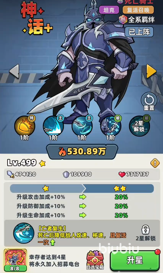 即便死亡也可以通过复活机制再次来到战场,该技能是可以进行升星的,后续升星能提高死亡骑士的复活次数,所以该角色的抽取性价比还是很高的。